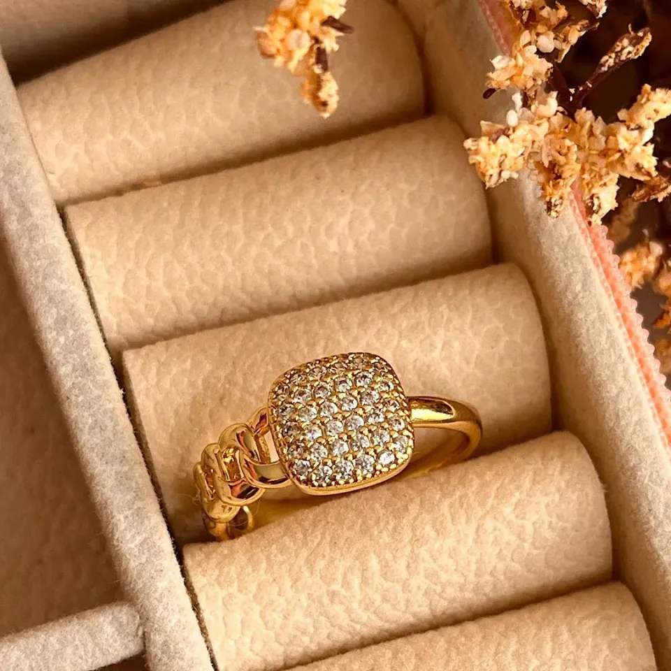 Anel com pedras cravejadas quadradoConfira opiniões e avaliações de clientes!