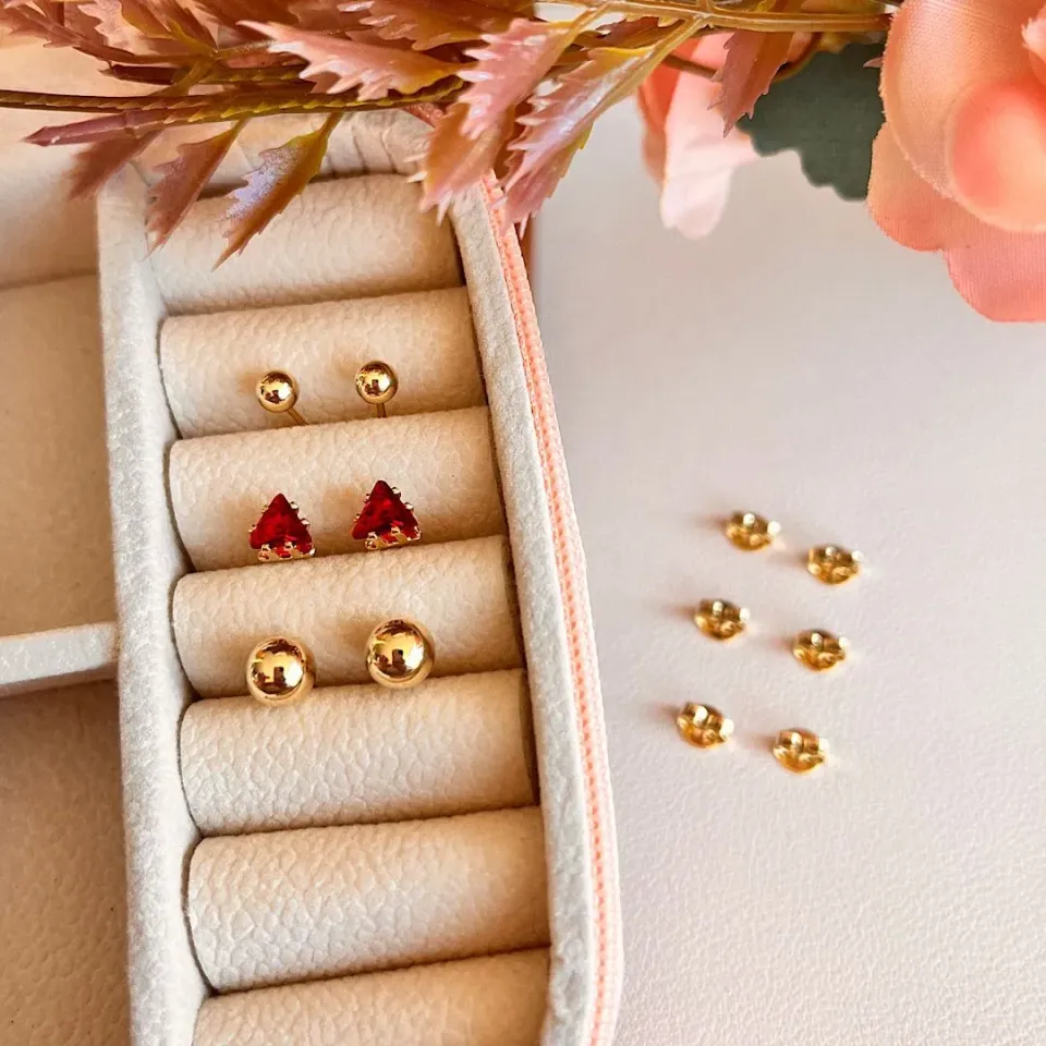 Brinco trio pedra triângulo vermelha e esferasConfira opiniões e avaliações de clientes!