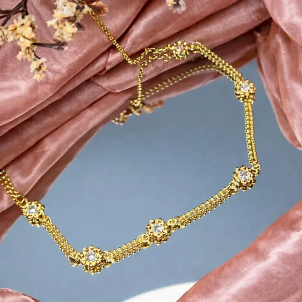 Colar elo duplo com flores e pedrasConfira opiniões e avaliações de clientes!
