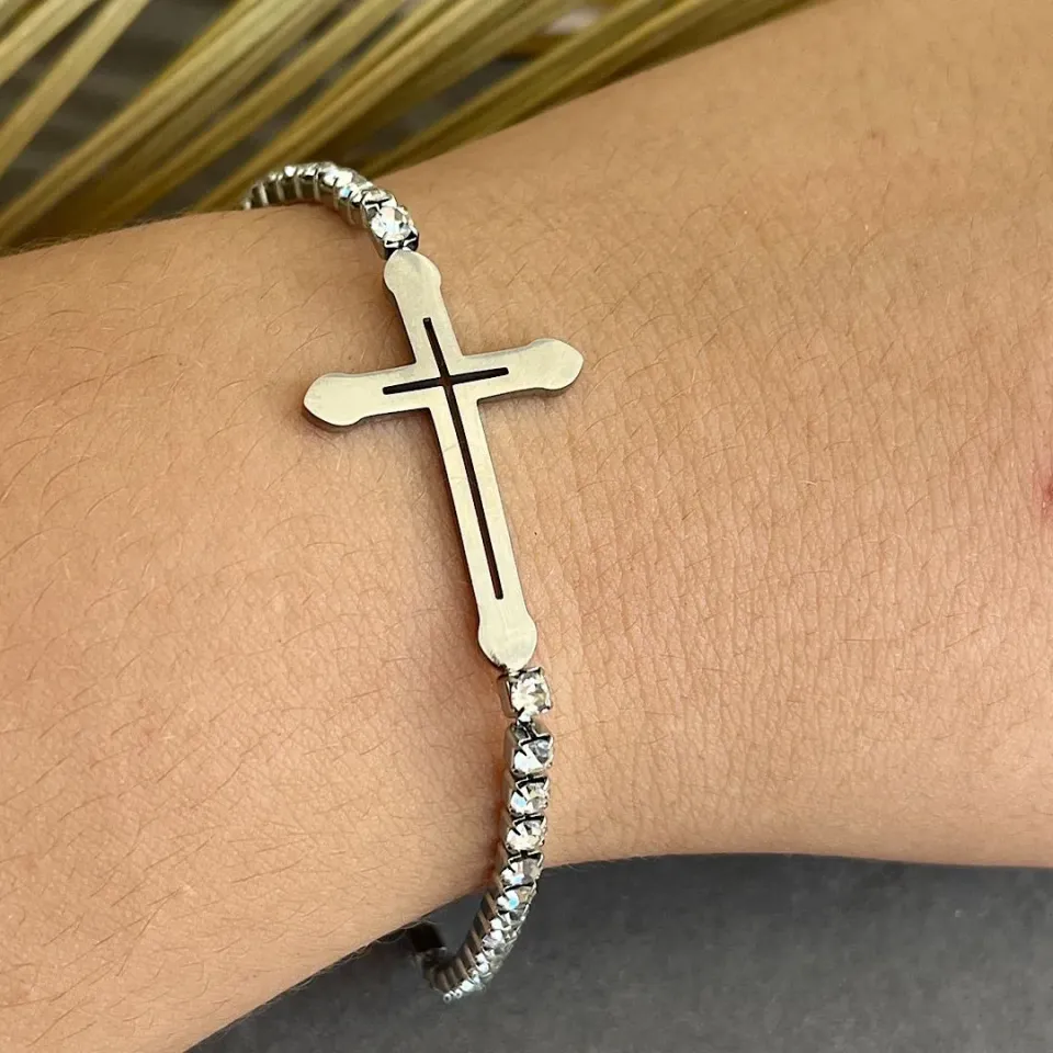 Pulseira em aço com pedras e cruzConfira opiniões e avaliações de clientes!