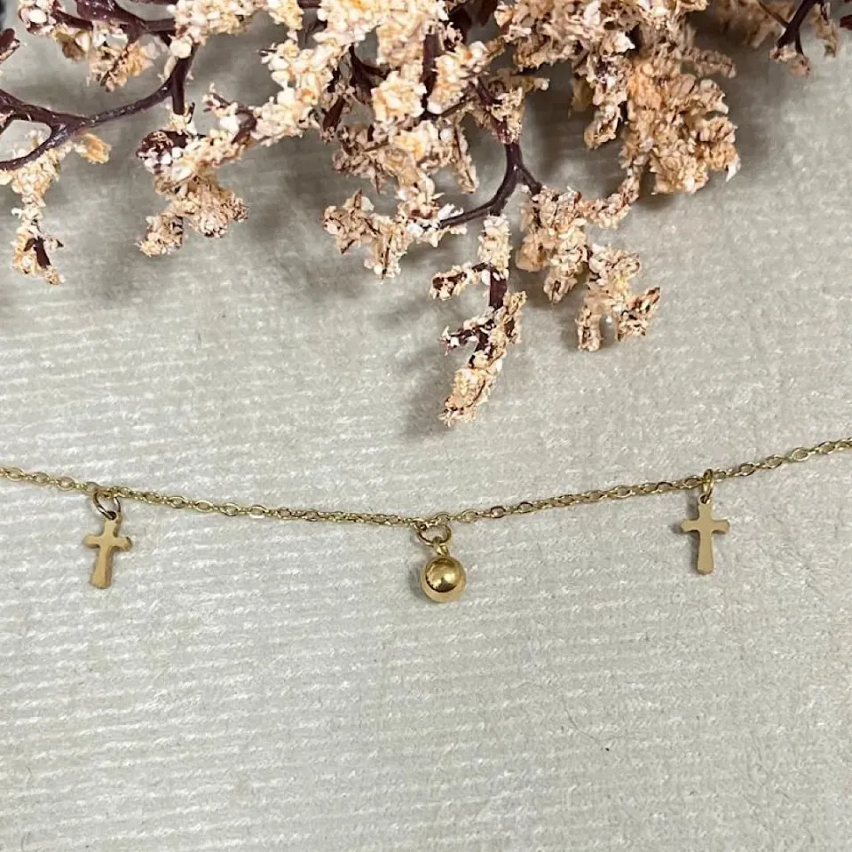 Tornozeleira com pingente cruz no aço douradoConfira opiniões e avaliações de clientes!